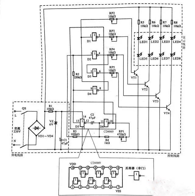 LED廣告燈控制線路主要是由供電線路、控制線路以及顯示線路等構(gòu)成的。該線路中電源總開關(guān)QS、橋式整流電路VD1~VD4、六非門電路CD4069、驅(qū)動晶體三極管VT1~VT4、發(fā)光二極管LED1~LED8為核心元器件和部件。
