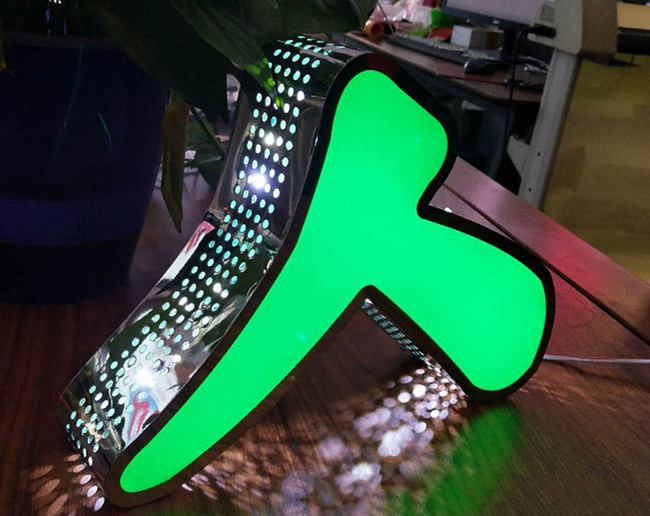 高邊發(fā)光字材料組成:鏡面不銹鋼圍邊(也叫光面)、亞克力發(fā)光面板、LED模組光源。