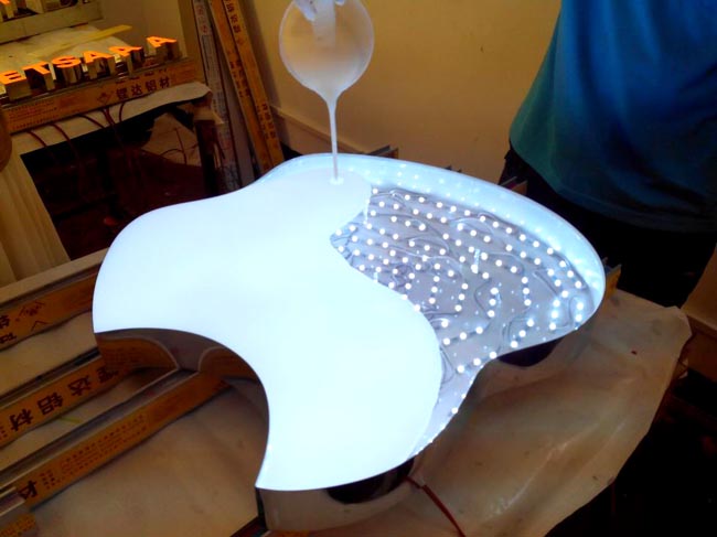 LED樹脂發(fā)光字是由外殼、填充原料、發(fā)光源三部分組成。是由調(diào)制好的樹脂倒入預(yù)先制好的模具里固化成型的,僅這個模具上,得考驗產(chǎn)品的外觀是不是美觀和標準。并且模具成本方面不能太高以及制作方便快速。固化后脫模修整裝燈了。