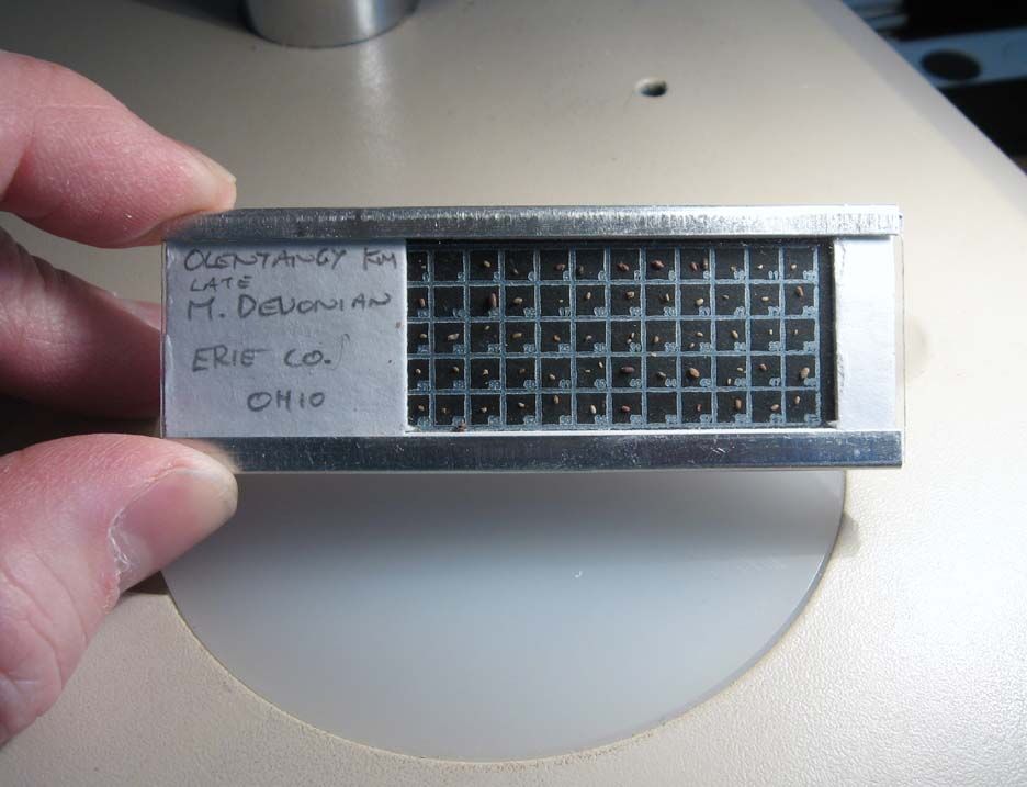 古生物研究中常常樣本是很小的微體化石,這里介紹一款傳統(tǒng)的微化石載物片,主要用來裝載微化石樣品。這個(gè)載物片與傳統(tǒng)的載玻片大小一樣,主體主要由三部分構(gòu)成:底板托是鋁材料制成;裝載者是一些帶有孔的硬紙板,孔有方形和圓形,有單孔或者多孔(有黑色和白色孔),有與硬紙板大小一樣的玻璃蓋。使用時(shí),玻璃蓋片蓋上載樣品的硬紙板,滑入鋁制的底板托中。76 mm (L) x 27.2 mm (W) x 4.5 mm (H)。